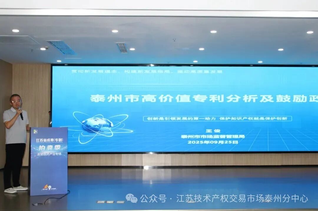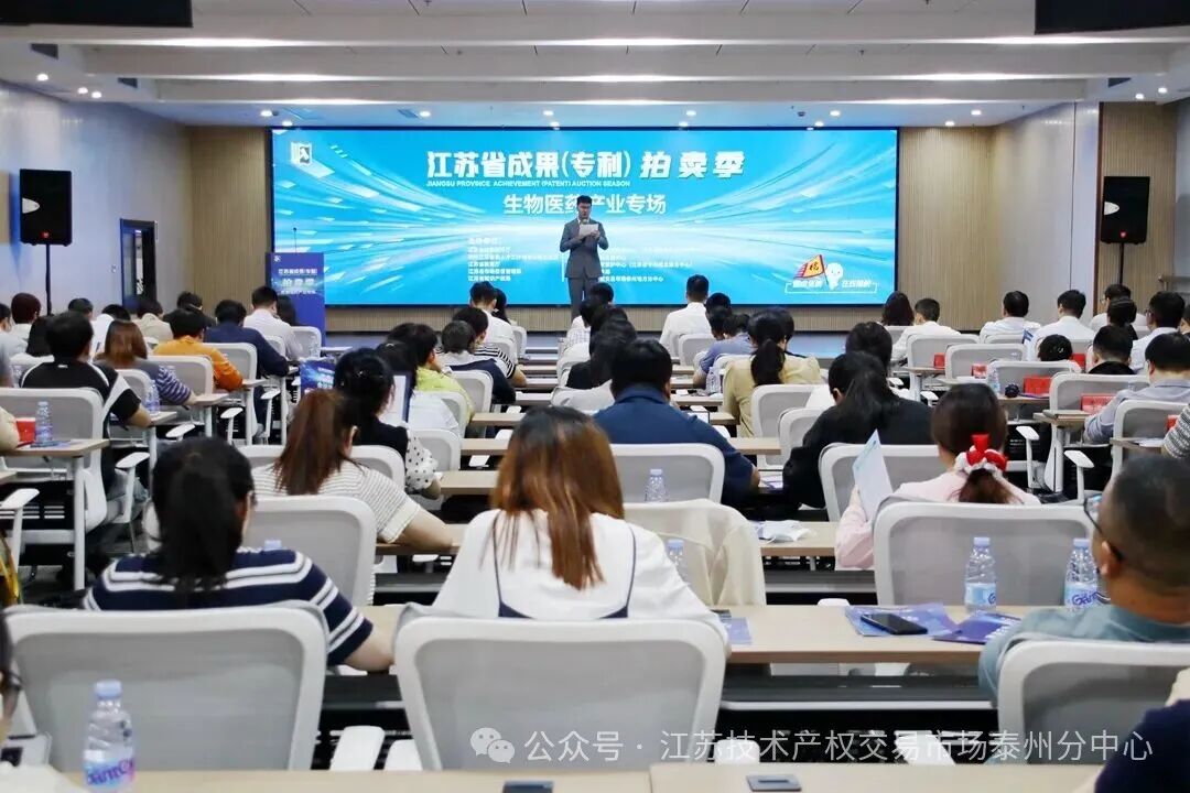 今天(9月25日)下午,2025年江苏省“成果(专利)拍卖季”生物医药产业专场现场活动在江苏省技术产权交易市场泰州地方分中心举办。活动由省科技厅、省委人才办等五部门联合主办,省科技资源统筹服务中心与市科技局共同承办。市科技局党组书记、局长贺骏,江苏省统筹服务中心副主任李红、医药高新区管委会副主任杜延宇,南京医科大学、中国药科大学和江苏大学的专家教授,全市生物医药企业代表等90余人参加活动。